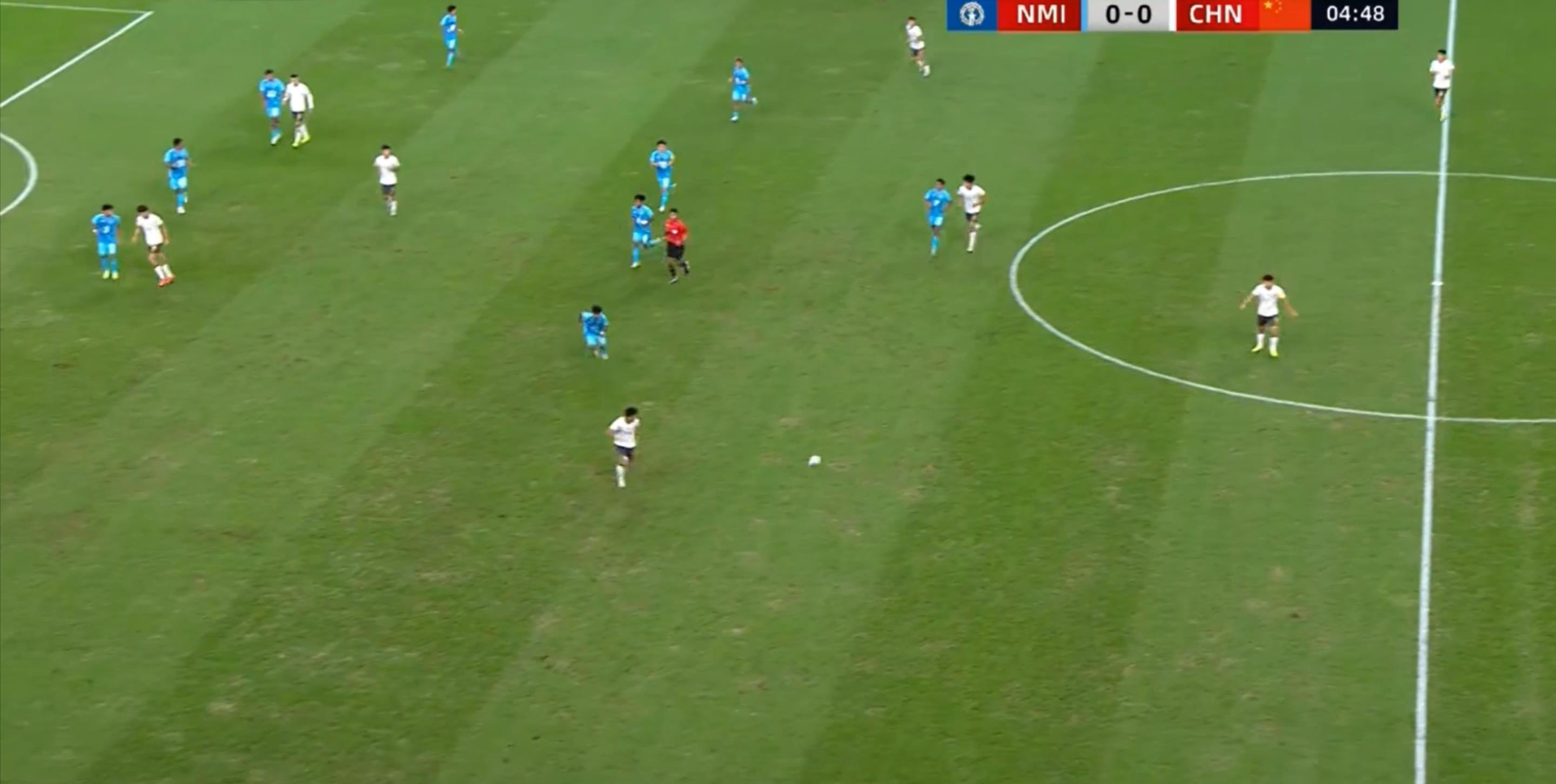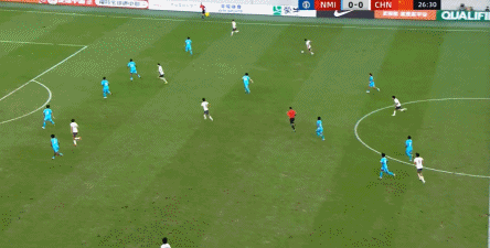 开场之后,中国队全面前压,对手也没有什么控球能力,这让中国队很少呈现无球阶段的站位,但在有球的时候,你还是可以轻松看到中国队摆出了双前锋: