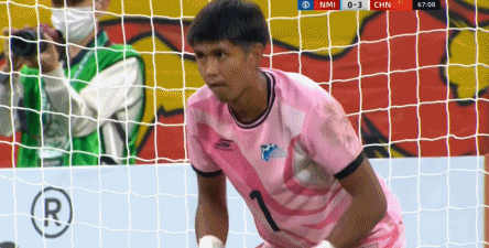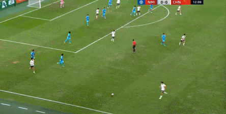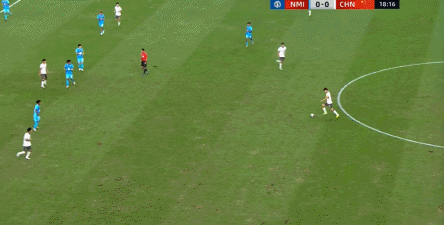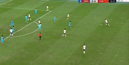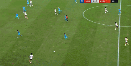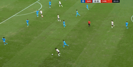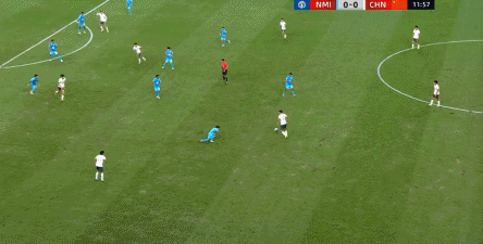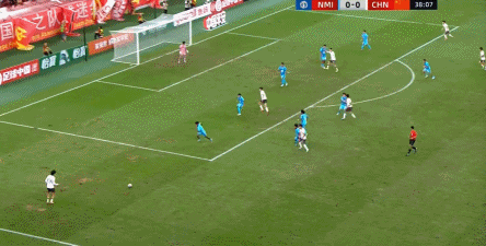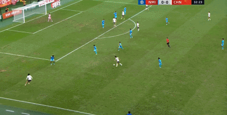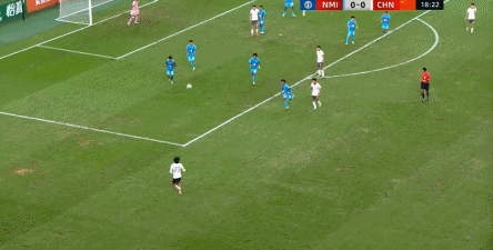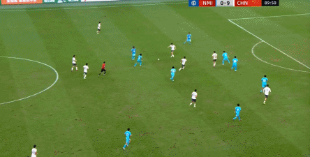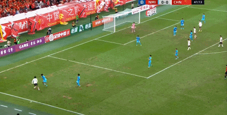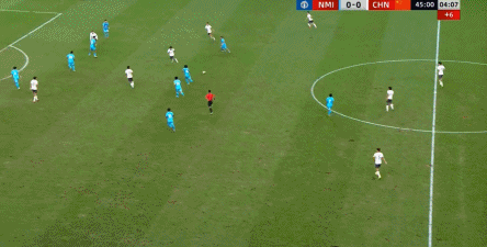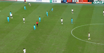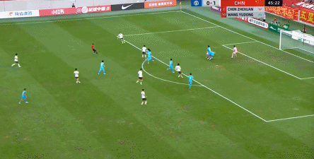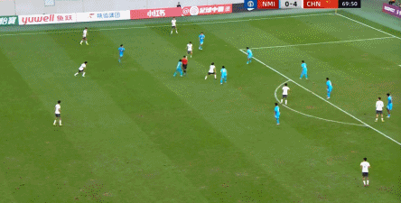 所以在这种低效进攻所导致的急躁情绪下,中国队甚至开始从后卫线送出长传,在线路和轨迹直冲门将的情况下,这更不是一个好主意: